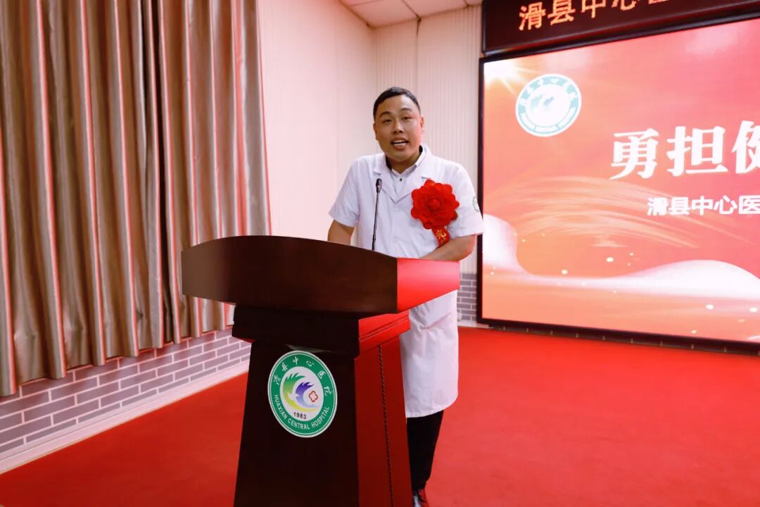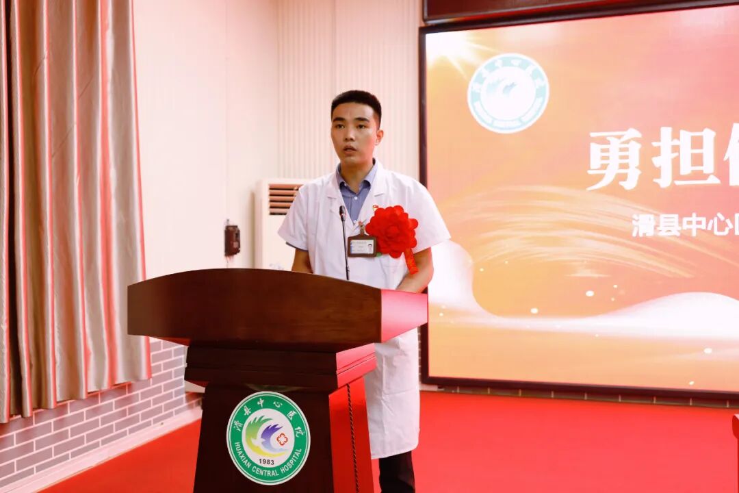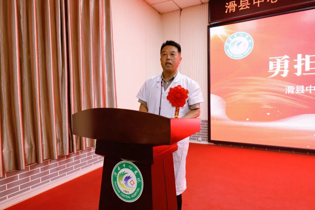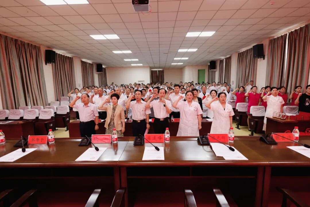 滑县中心医院医疗健康服务集团总院院长席连峰带领全体人员在党旗下宣誓。